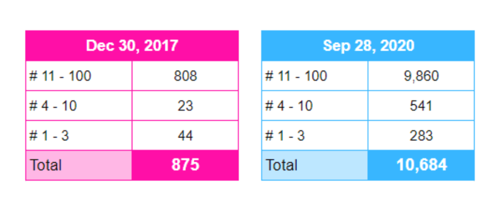 When COVID came around in March 2020, the site was in a prime position to take advantage of the growth in online plant sales. By the end of the project period, the site had grown its organic sessions by +2,000%, and the total # of KWs within positions #1-100 increased by +1,100%. The project ended in September 2020 due to a change in ownership.
