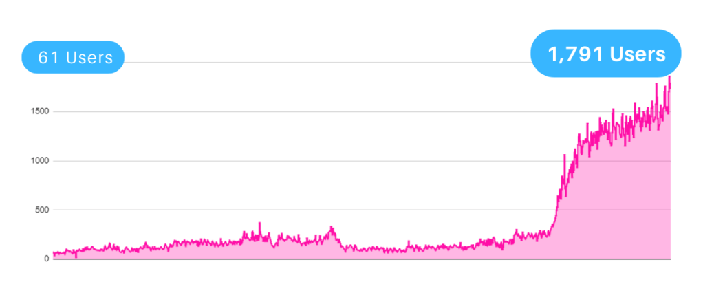 - Sessions per day (as of Jan 2022): 1,791 (2,836% increase)