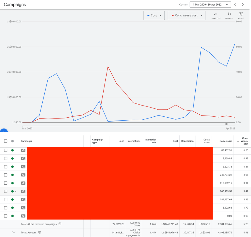 Our team of ad specialists began the ad campaign on Google with a strong focus on the most popular brands like Angel’s Envy, Johnny Walker, Don Julio, and Tito’s Vodka. These campaigns immediately brought sales to the website at incredible ROAS (as high as 15x). As the account matured, we expanded our focus into product category-focused campaigns to maneuver around OOS issues and diversify the campaign’s ad sets. Now, 2 years into managing this alcohol website, we have become the go-to subject area experts in alcohol, creating successful ad campaigns for niche products like Soda Jerk, Cocktail Caviar, and Kyodie whiskey. We’ve also been able to expand our reach outside of Google, by optimizing ads on both FB and Tiktok.